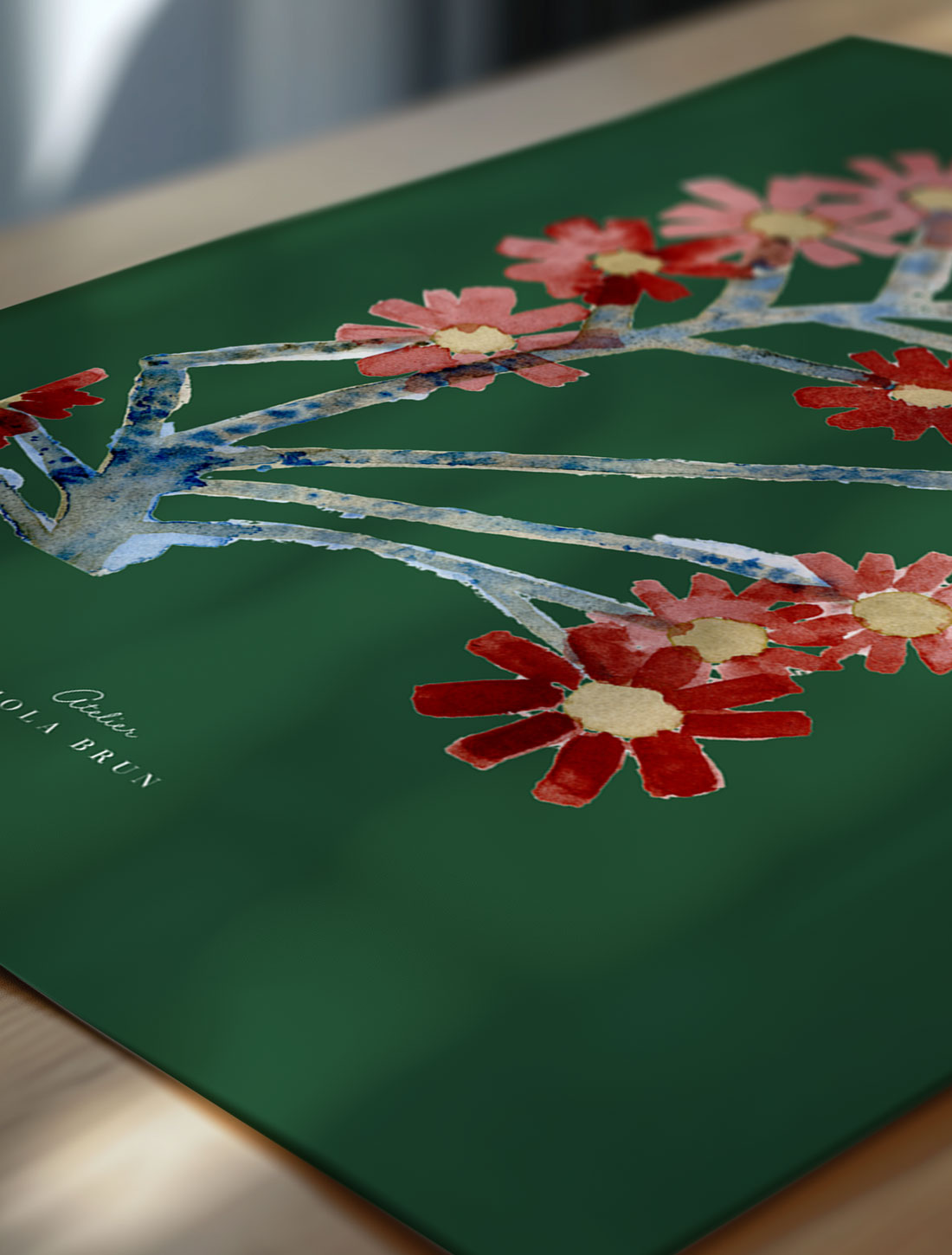 Motivet viser grene med store, grafiske blomster, hvor både grenenes former og blomsternes konturer i samspil skaber et legende og poetisk udtryk. Blomsterne fremstår i varme røde og lyse nuancer, mens grenene er holdt i sarte blå og gråblå toner. Den dybe grønne baggrund fremhæver motivets former og farver, hvilket giver dybde og en markant grafisk kant til kompositionen